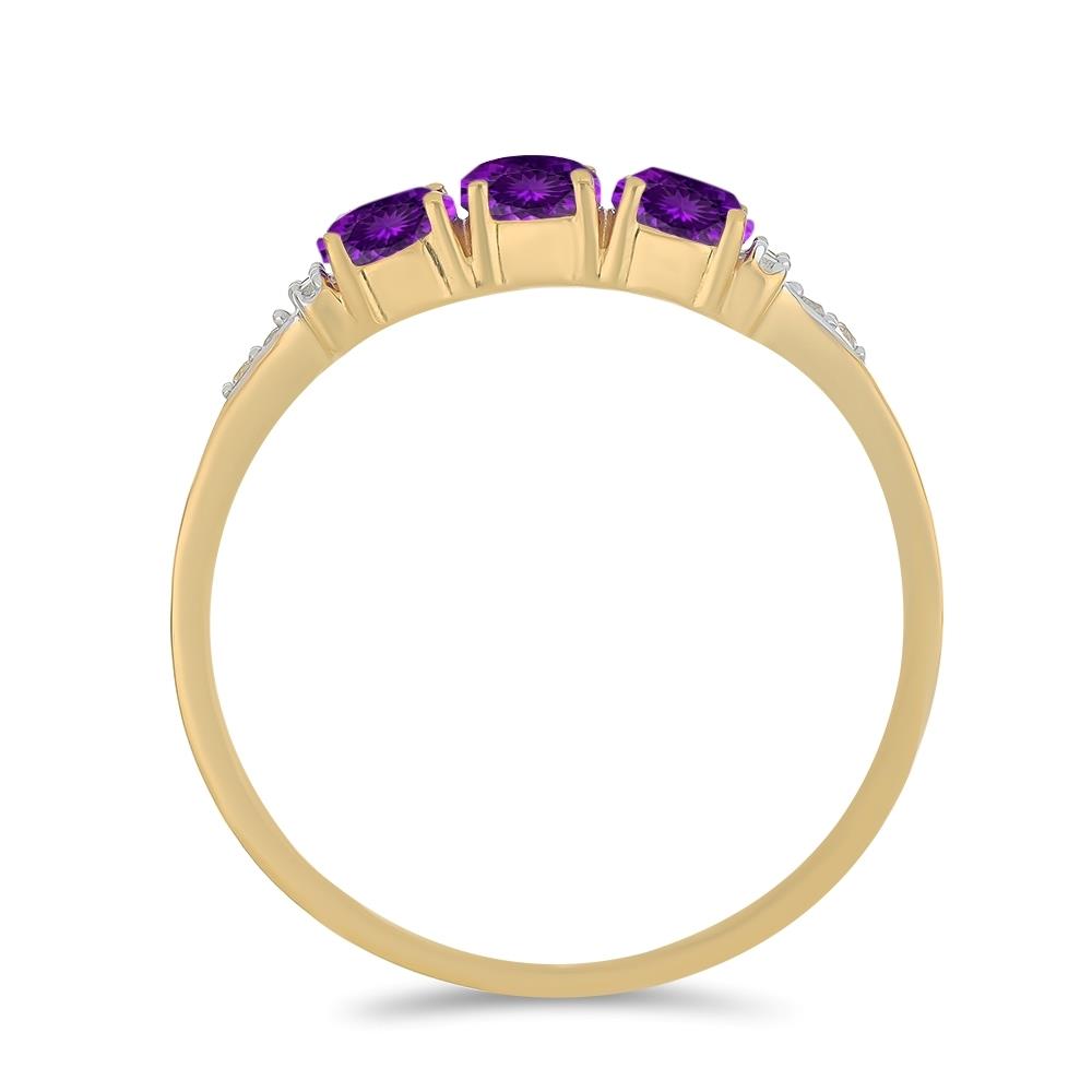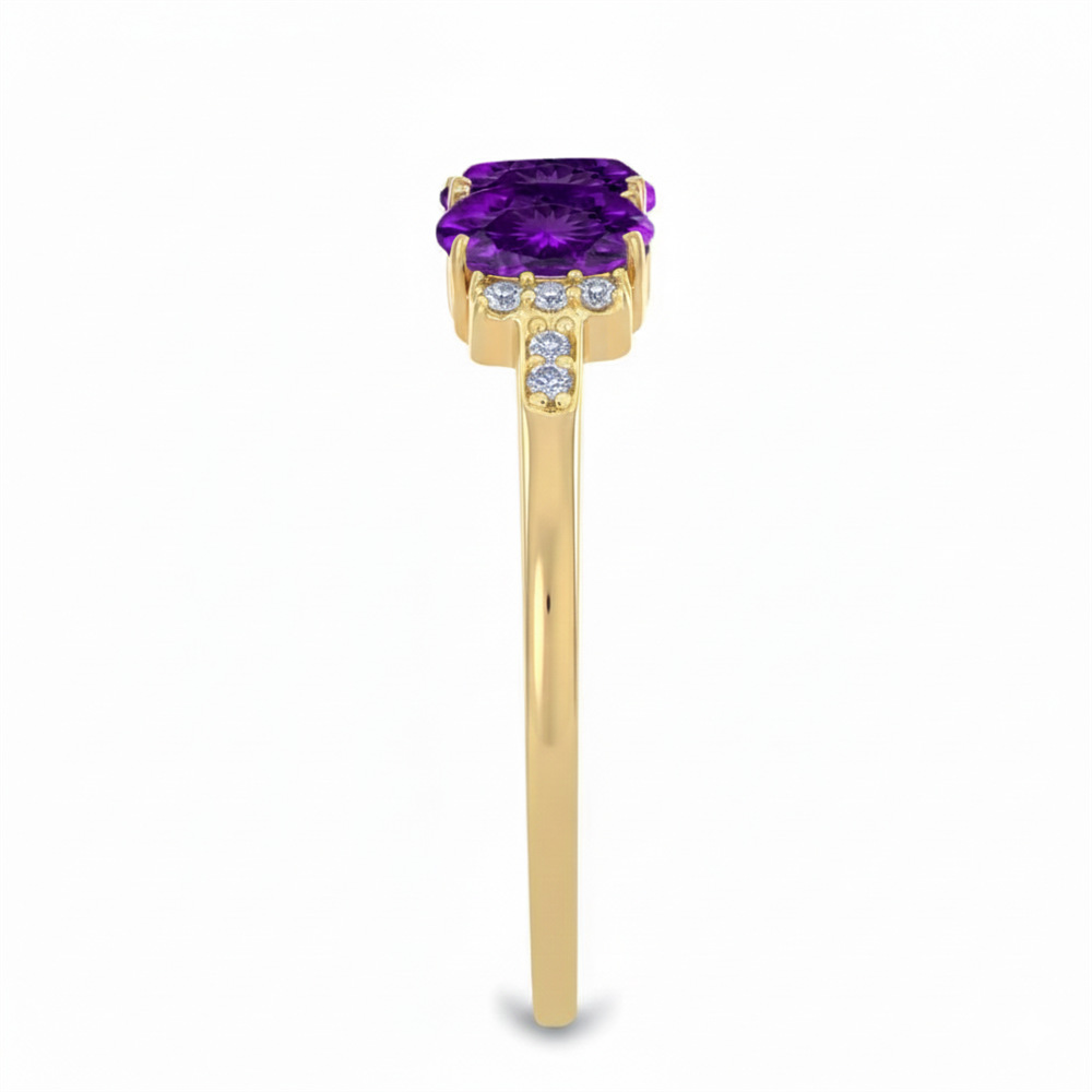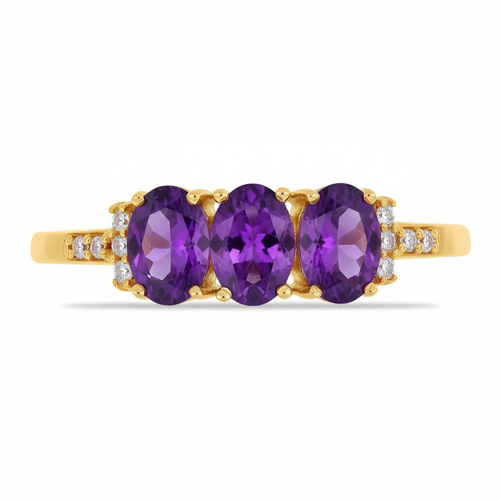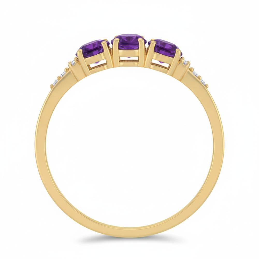 The key characteristic is the elegant Three-Stone Horizontal Ring arrangement. The ring features three magnificent Oval Cut African Amethyst gemstones (4x6 MM, 1.650 CTS total approx.) set in a linear pattern across the finger. The Prong Set main stones are complemented by sparkling White Diamond Accents set along the shoulders of the band. This balanced and symmetrical design is highly popular for anniversaries and makes a significant statement, crafted in durable 14K Gold.