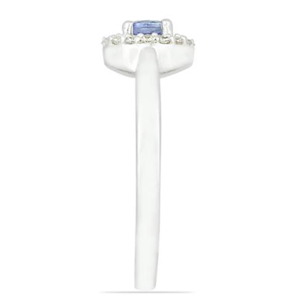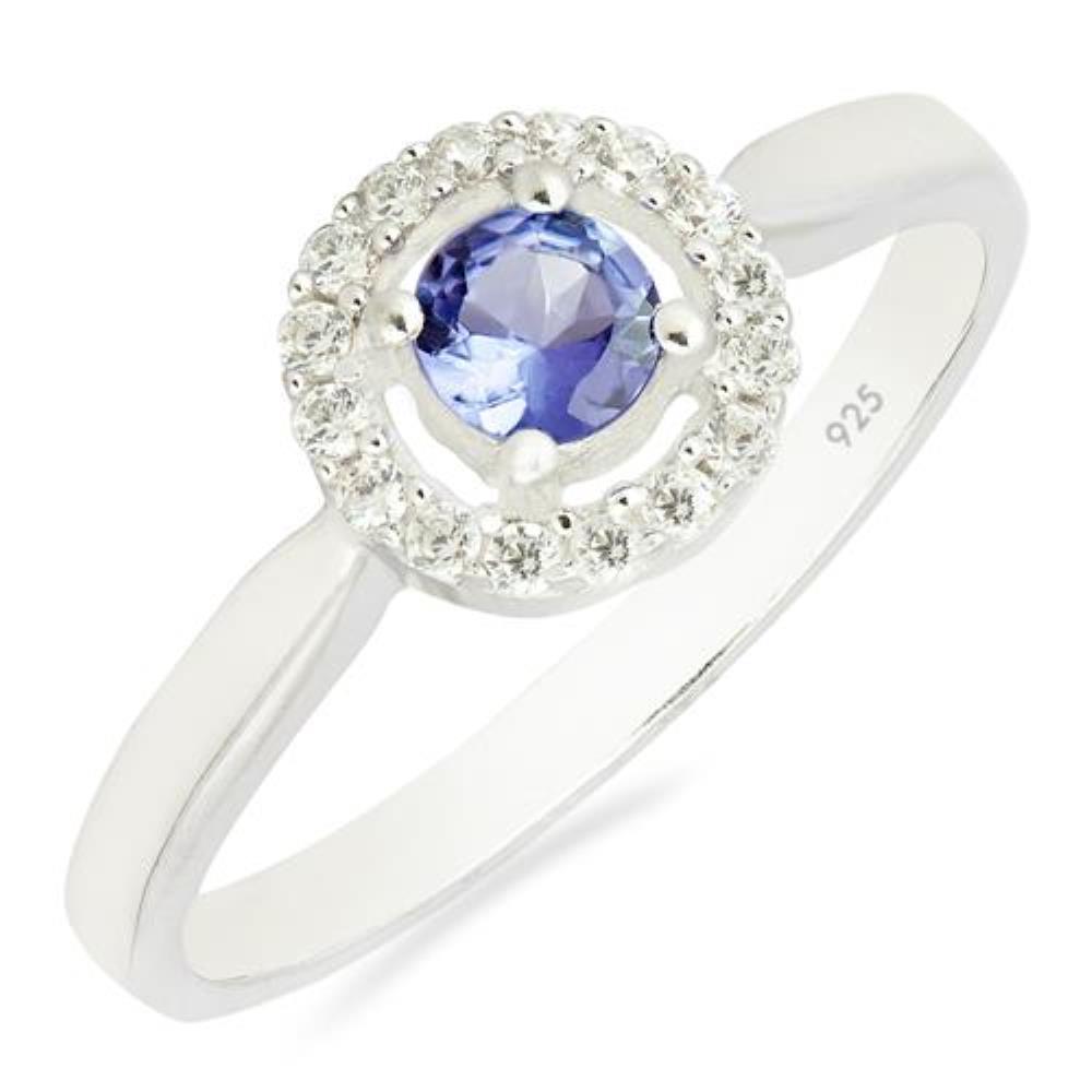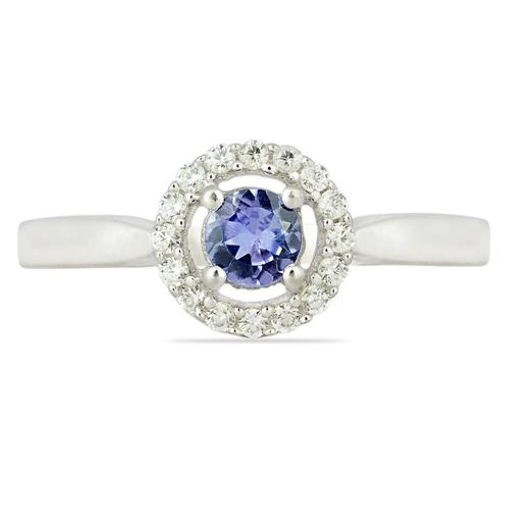 You are seeing a sterling silver halo ring with an original 0.30 ct round tanzanite positioned at the center. Additionally, it has a halo of 1.20 mm round cubic zirconia, which embellishes the impressiveness.